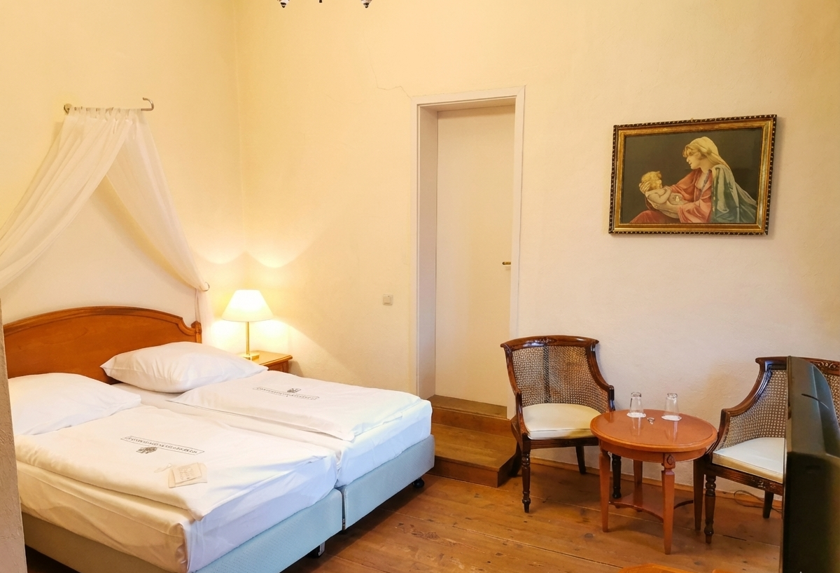 Dieses Zimmer befindet sich im vierten Stock des Kastells und ist damit unser höchstgelegenes Zimmer des gesamten Hotels. Aus dem geräumigen Wohnzimmer haben Sie durch die Bleiglasfenster einen schönen Blick auf den Schlosspark. Von hieraus können Sie mit dem Bademantel in unseren Wellness- und Beautybereich gelangen. Das Zimmer ist insgesamt 34 m² groß.
